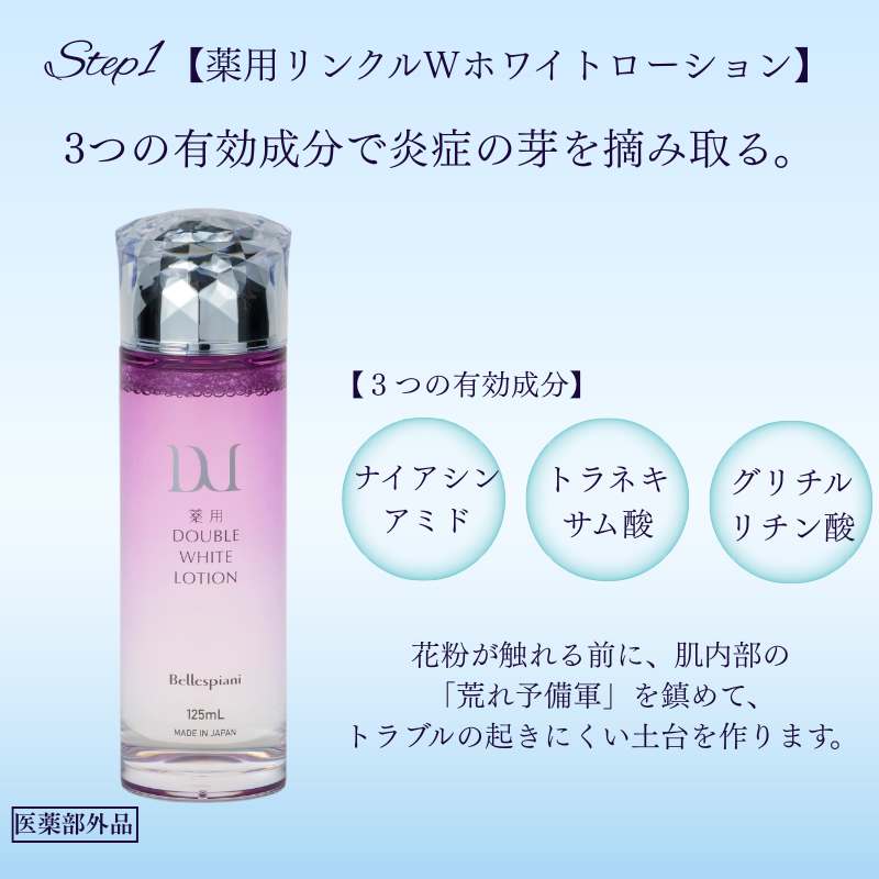 薬用ローション → 薬用美容液 → 高保湿クリームの3ステップで、